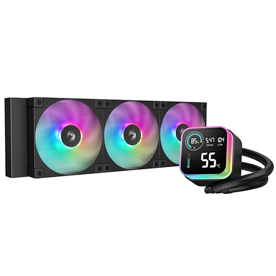 The LQ360 360mm AIO, a revolutionary cooling solution that seamlessly blends top tier performance with aesthetics. In the Segment LCD Screen ERA, the LQ360 exemplifies the perfect coexistence of appearance and functionality. Its low-profile and restrained design allows users to unleash the full potential of their hardware without compromising on style. The LQ360 also features an ARGB Halo on the magnetic pump head cover and triple FD12 ARGB fans, adding vibrant and customizable lighting elements that enhances the visual build appeal.