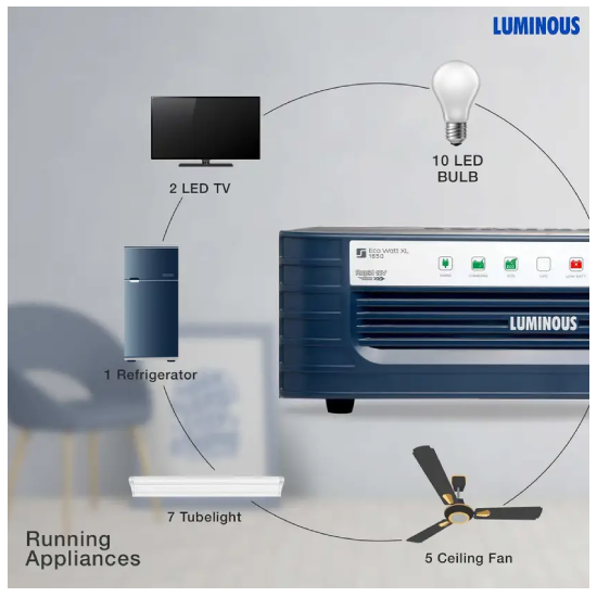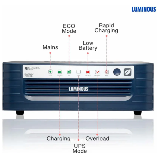 Boasting a rated power of up to 1260 W and a capacity of up to 1500 VA, the Luminous Eco Watt XL Rapid 1650 Square Wave Inverter delivers powerful and smooth operation.