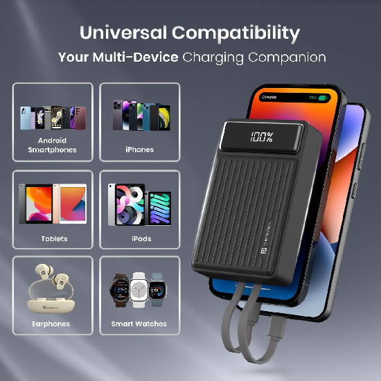 - Triple Output: Charge 3 devices simultaneously with this 22.5-watt slim power bank’s 3 output ports- Mach USB A, in-built cables- Type C and 8 pin.
