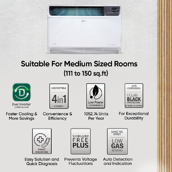- LG Windows AC with inverter compressor: Economical and easy to install. It has variable speed compressor which adjusts power depending on heat load and is energy efficient